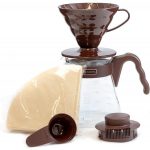 – 1 kit Hario V60: 1 cafetera de degoteig de plàstic, 1 servidor de cafè de vidre amb tapa (700 ml), 40 filtres de paper Hario (mida 02) i 1 cullera dosificadora.