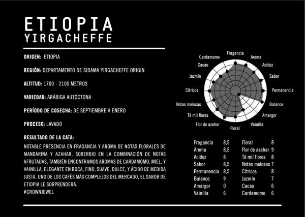 It is an Arabica coffee grown at 1770-2200 meters above sea level and treated with a natural drying process. We find a fragrance, aroma and taste of exquisite complexity, floral notes of orange blossom and jasmine, fruity mandarin, lemon and grape shine remarkably together with spices such as cardamom and light cocoa undertones. The cup shows a clearly acidic balance.